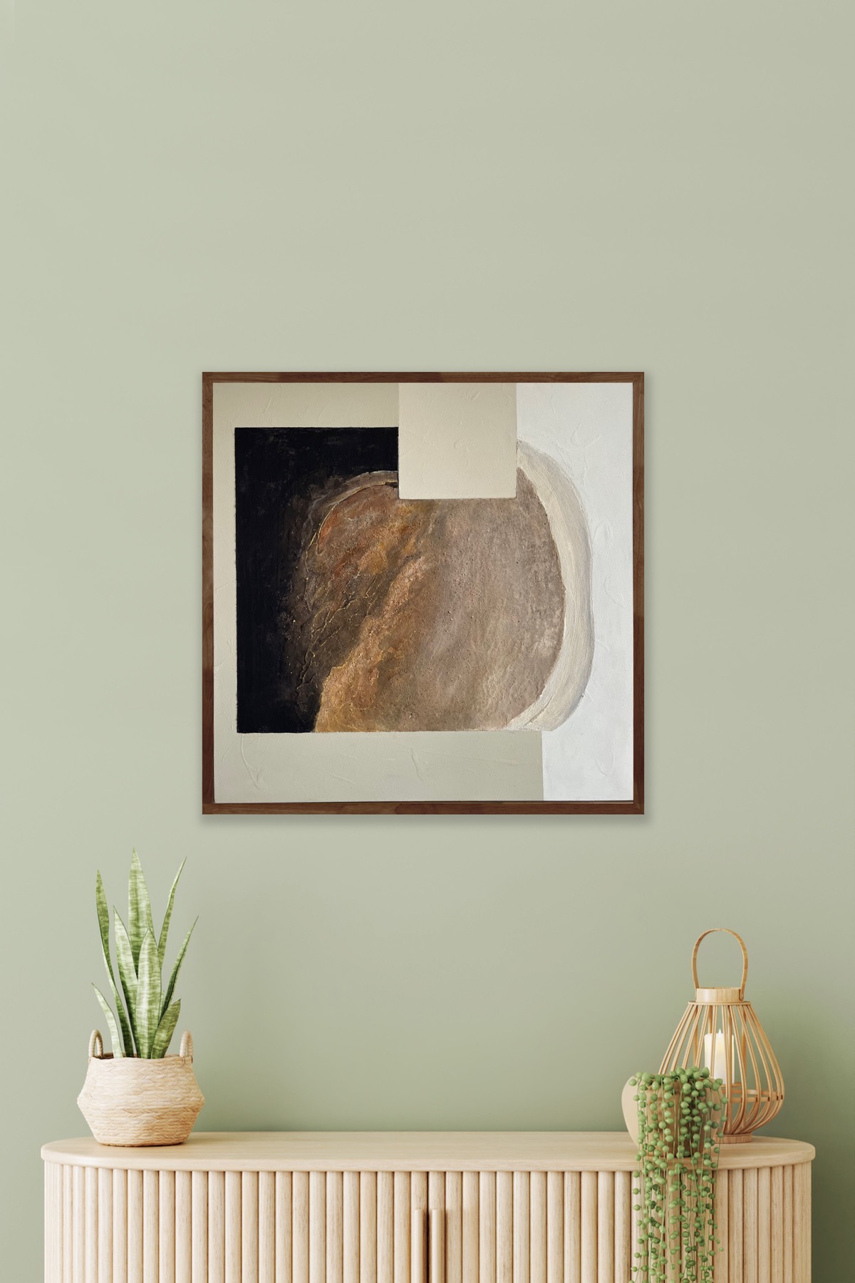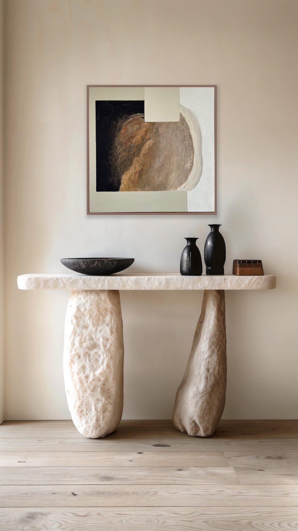 Šis paveikslas – tai tylus traukos jėgos apmąstymas. Ne tik fizinės, bet ir vidinės – tai, kas mus traukia vienas prie kito, prie idėjų, prisiminimų, būsenų. Kūrinio faktūra primena žemę, mineralus, natūralų ciklą, o geometriniai plotai simbolizuoja žmogaus bandymą struktūrizuoti tai, kas yra neapčiuopiama.