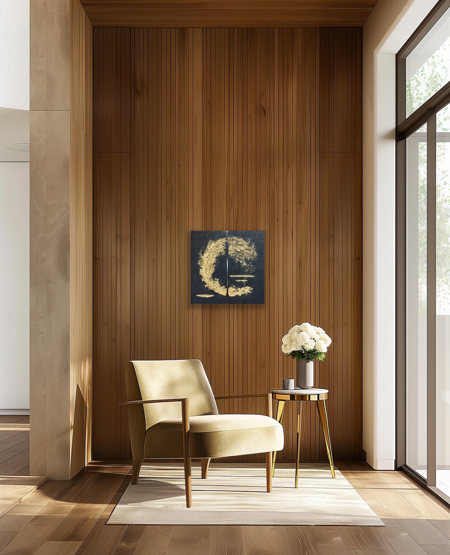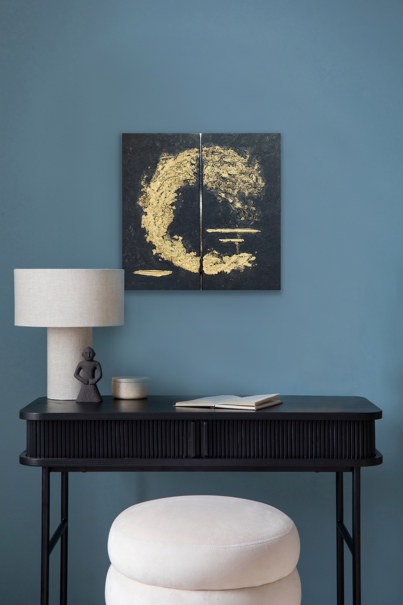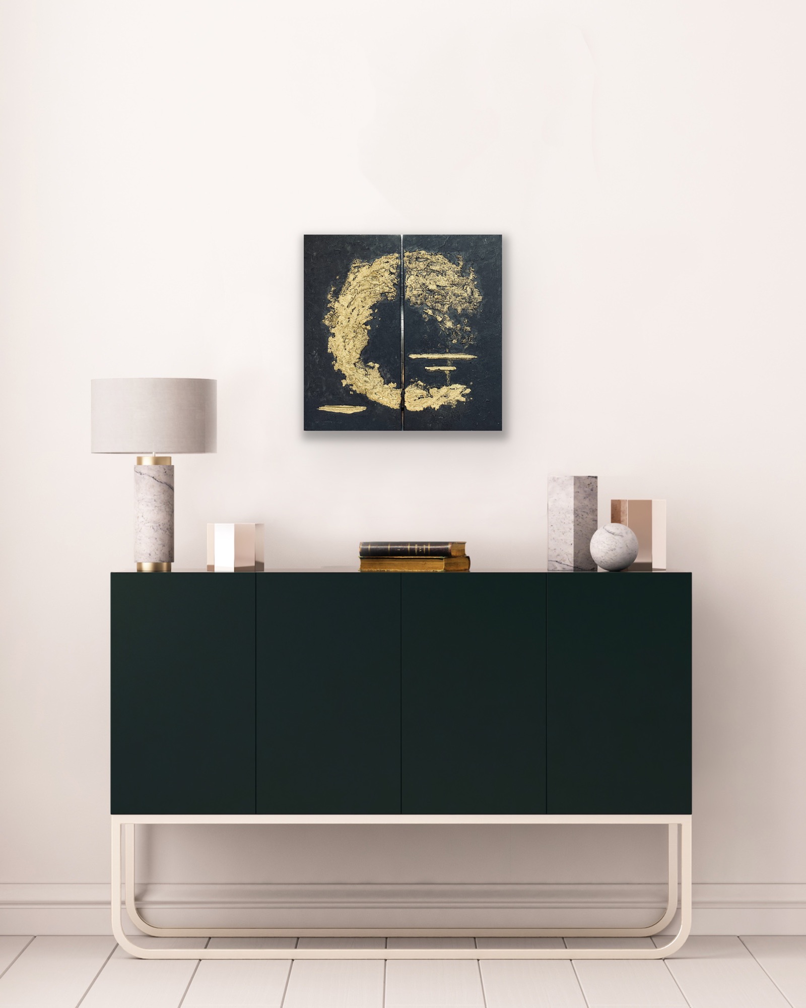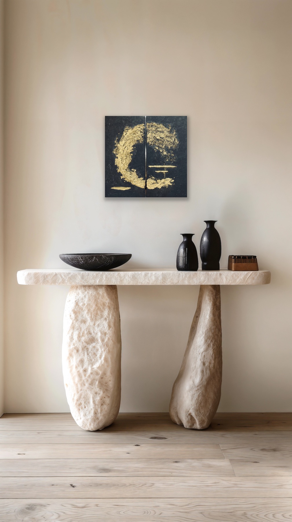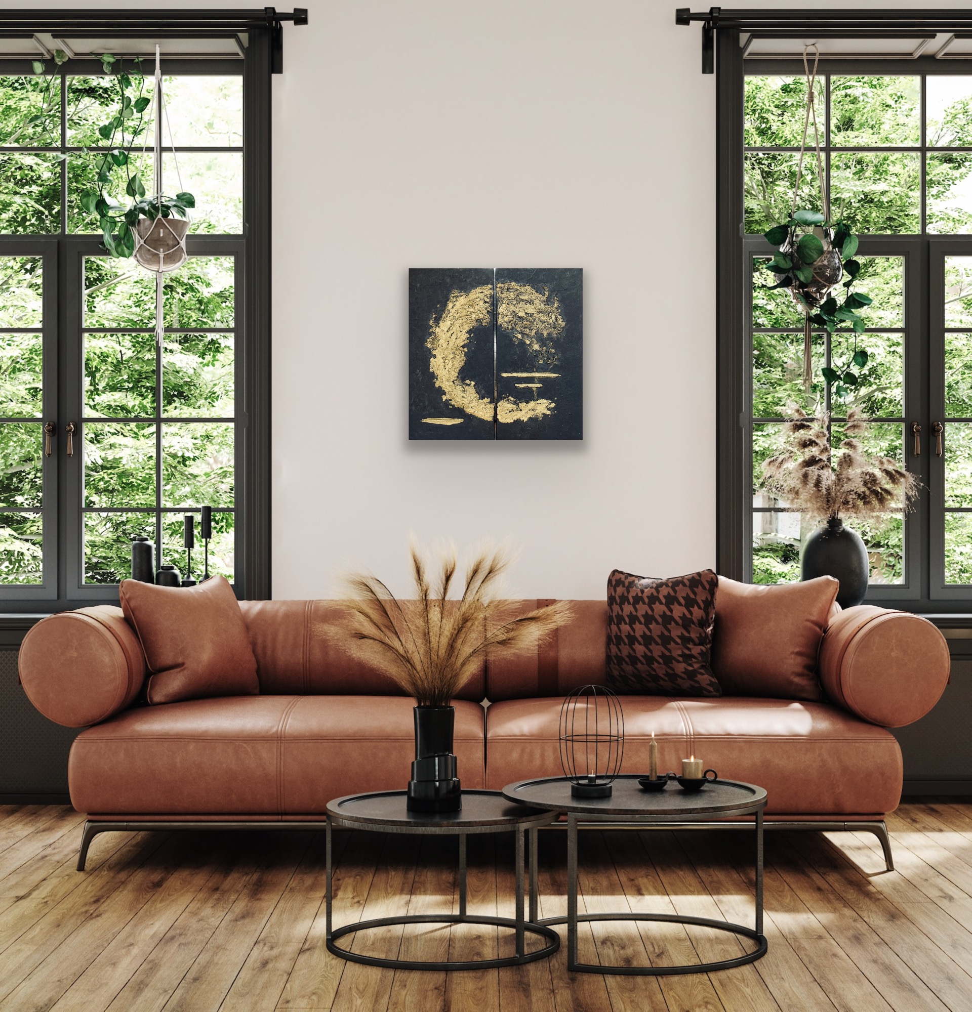 Rankų darbo paveikslas sukurtas naudojant aukštos kokybės medžiagas: molio tinką, akrilinius dažus ir prabangius aukso akcentus. Dviejų dalių kompozicija (diptikas) prideda modernumo, leidžiantį paveikslą pritaikyti skirtingoms erdvėms. Šis kūrinys – tai ne tik interjero akcentas, bet ir simbolinis priminimas apie gyvenimo energijos nenutrūkstamą srautą.