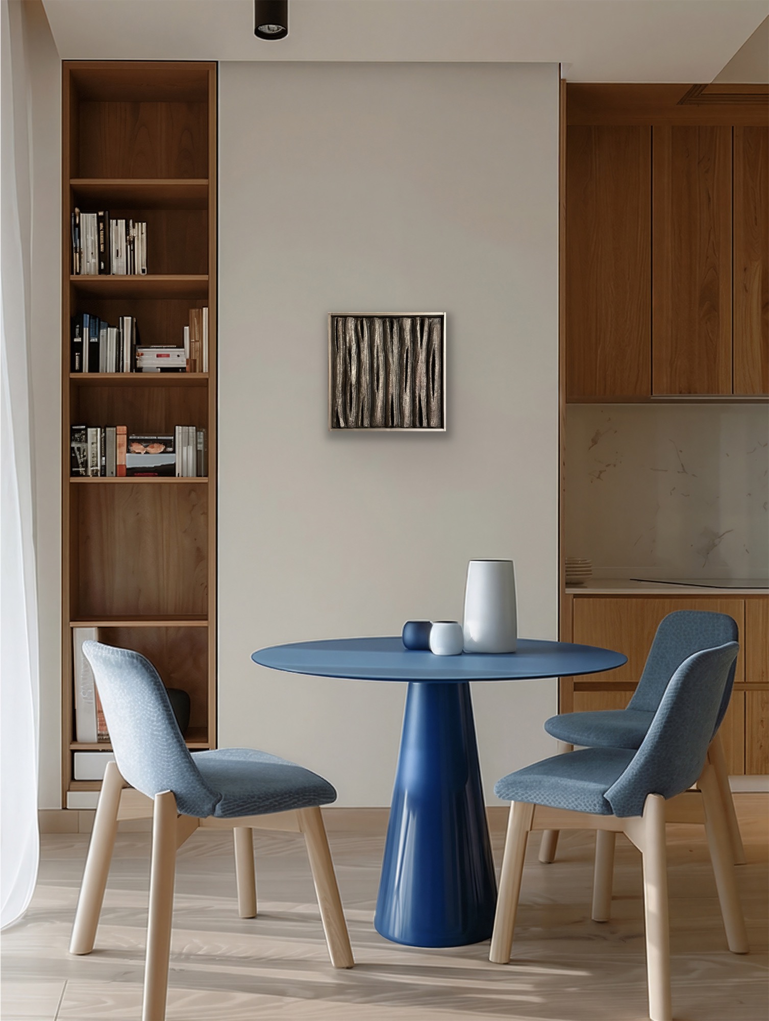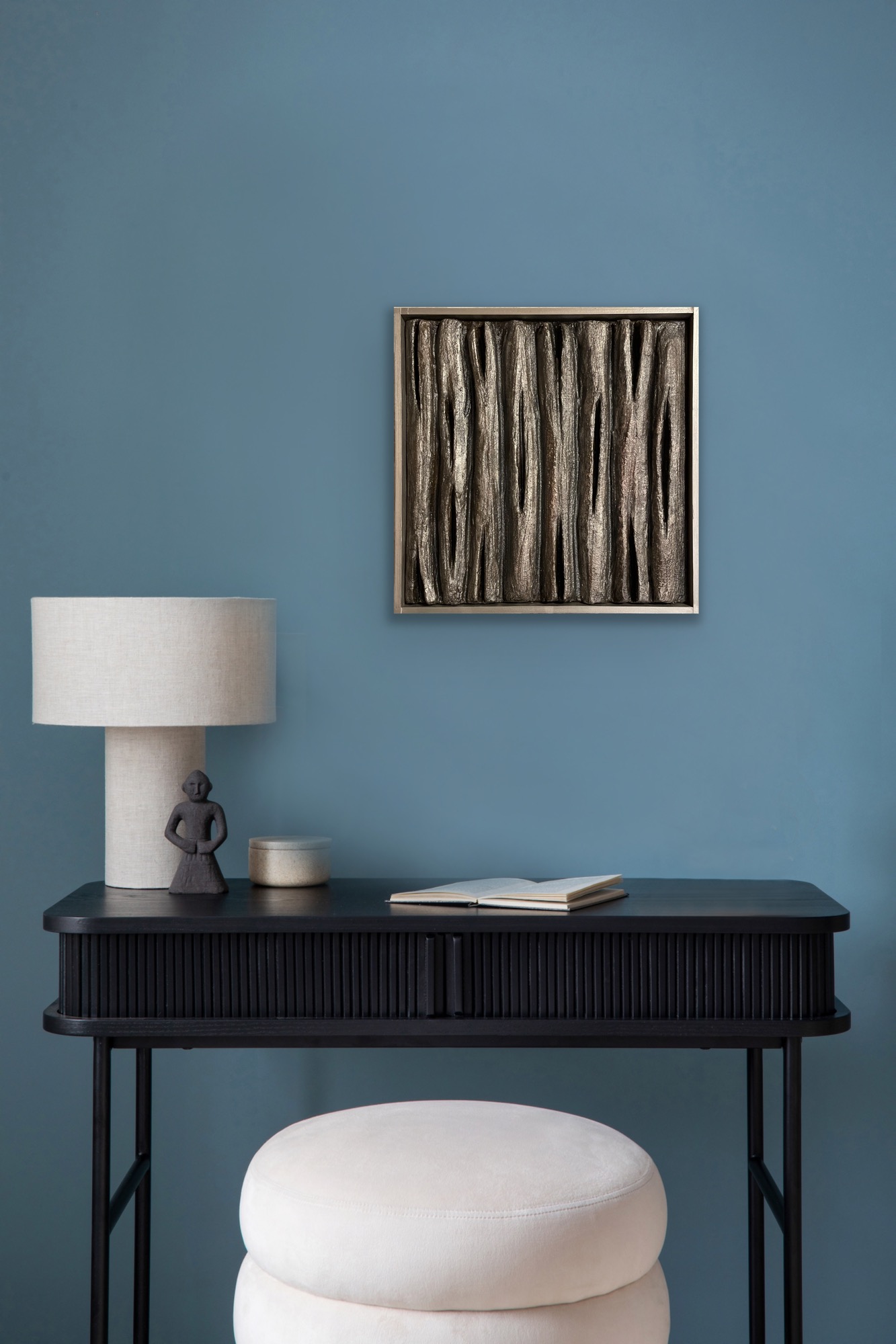 Paviršius sukurtas naudojant molio tinką, akrilą ir putplastį – tai leidžia išgauti gilią, organišką formą, kuri keičiasi priklausomai nuo šviesos kampo. Tamsus tonas, subtilus metalo efektas ir vertikali kompozicija suteikia erdvei solidumo ir charakterio.